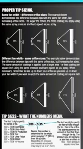 The T93R is available in 145 fan width/orifice combinations so you can match the right tip to every coating you spray. The chart below lists all available sizes. 5000 PSI (345 BAR)